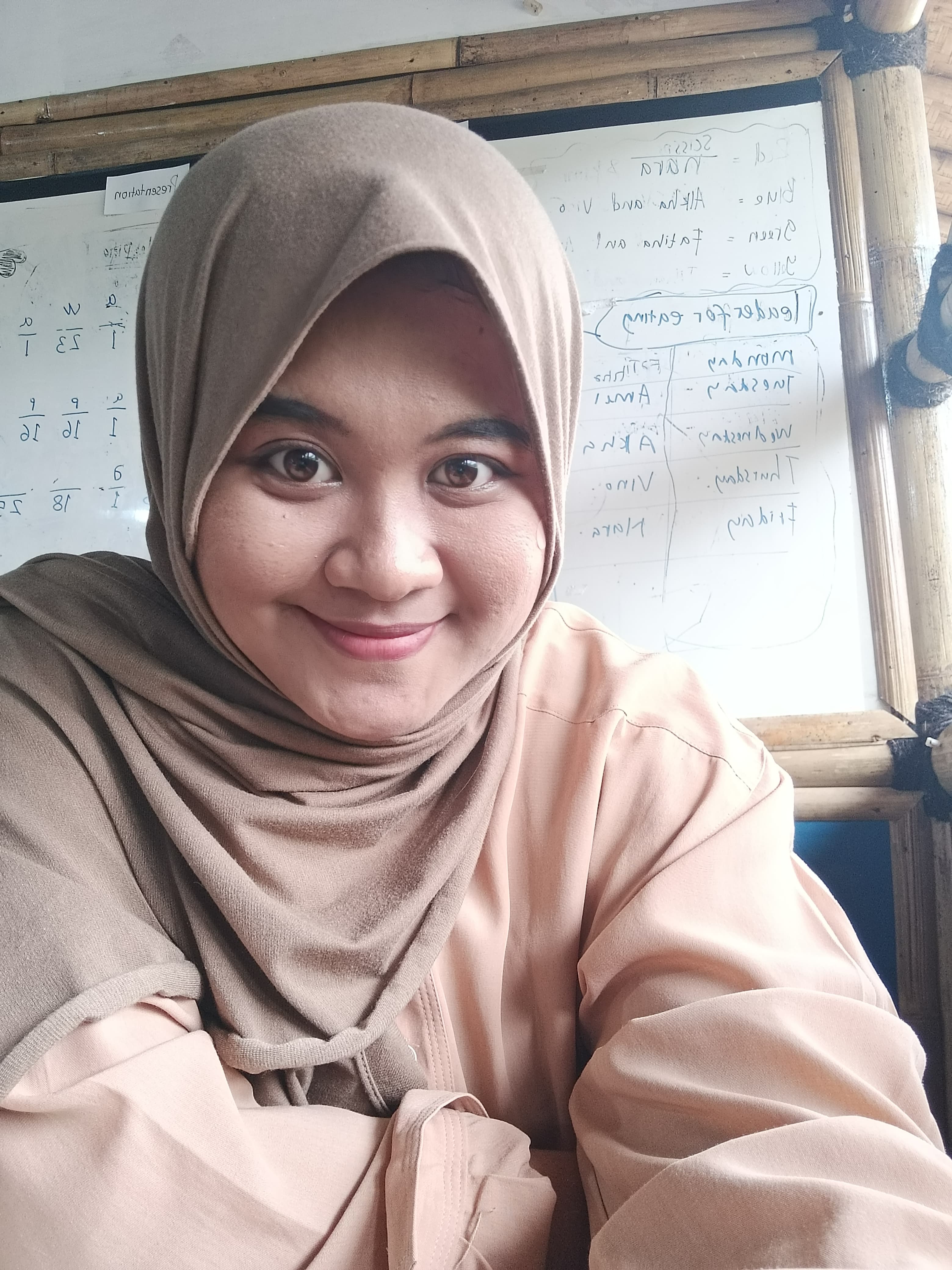Hello, My name is Vrizka Nuria Arsita. My friends used to call me Emon. I come from Bogor and now I am almost into 20 years old in january. I love teaching since I was in the junior high school like guide my classmate who did'nt understand the materials. It was the reason why I got into English education department. I did many part time independently. It's all started in my second years in my senior high school. I did teaching reading Al-Qur'an because I had some basic knowledge from my boarding schools. Then, when i got Into university level I start teaching English language and Calistung for kids. Here, I want to improve myself as a teacher in a new place and for many new experiences.